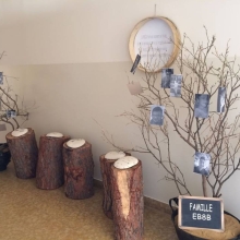 sont accrochés sur des troncs d'arbres tout au long du couloir du cycle complémentaire