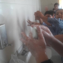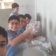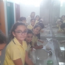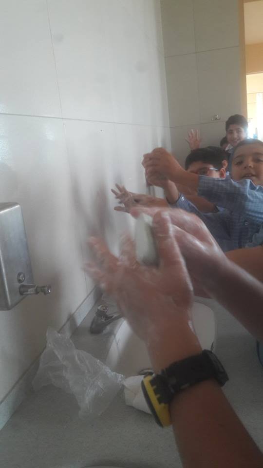 Les élèves de la EB4 ont appris à l’aide d’une vidéo présentée sur le « Built- in TV » à la BCDI à quels moments il est important de se laver les mains. Sous la supervision de leur enseignante du Protect-Ed, Mlle Mona Touma, les élèves de la EB4 A se sont exercés à se laver toutes les parties des mains : paumes, entre les doigts, dessus, poignets, pouces, bout des doigts et ongles !