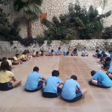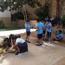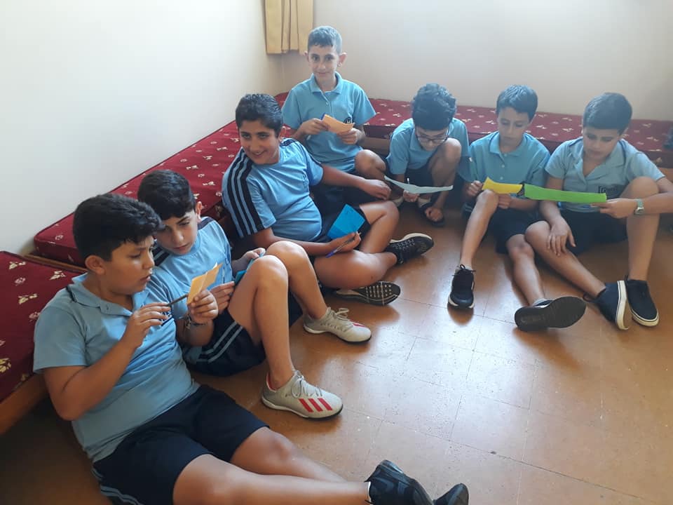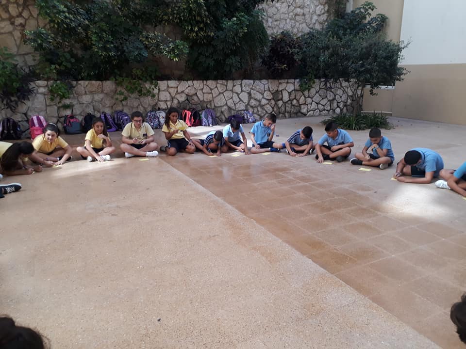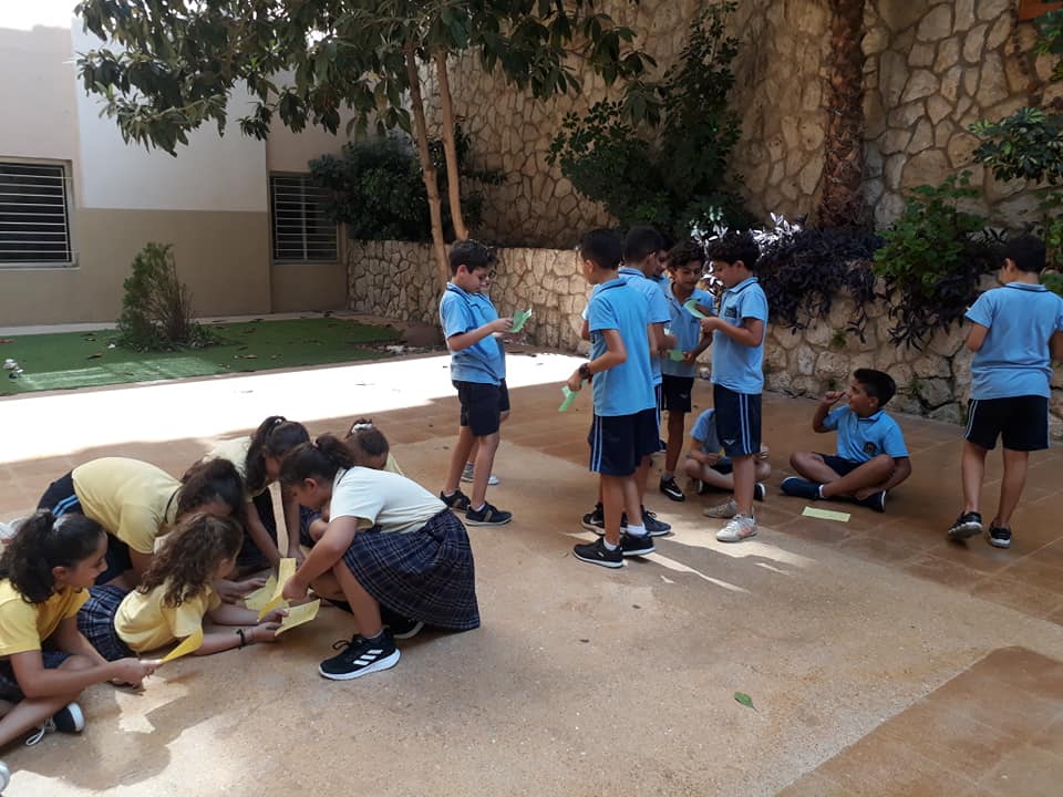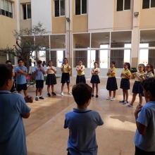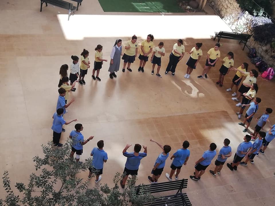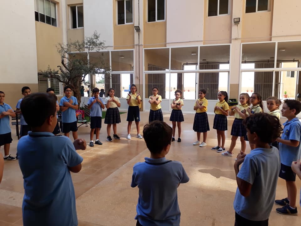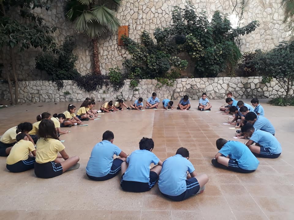 La semaine passée, les élèves de la EB5 et EB6 se sont rassemblés à la cour où ils ont appris le chant dédié à Ste Thérèse : "tari2 zghir w7obb kbir ".