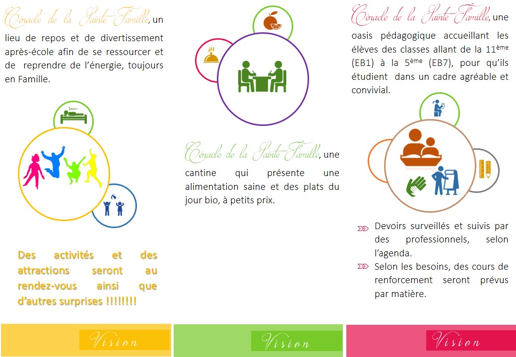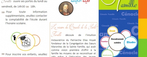 Cénacle de la Sainte Famille accueille les élèves des classes allant de la 11ème (EB1) à la 5ème (EB7), afin  qu'ils étudient dans un cadre paisible et chaleureux du lundi au vendredi de 14h30 à 18h00.